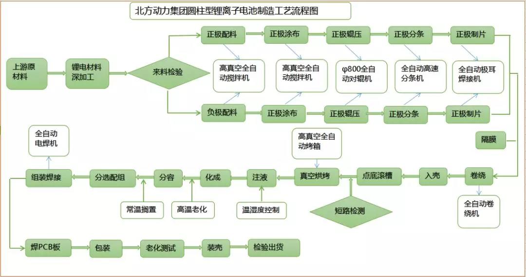 導(dǎo)語 經(jīng)過多年發(fā)展,鋰電池產(chǎn)業(yè)已經(jīng)形成了專業(yè)化分工程度高的完整產(chǎn)業(yè)鏈。隨著國家政策的支持,以及電動車新國標的出臺,未來鋰電池將是電動出行工具的首選。目前,市場上鋰電池品牌參差不齊,不乏濫竽充數(shù)者。那么好的鋰電池,到底是如何制作的? 一:圓柱電池生產(chǎn)工藝流程圖
